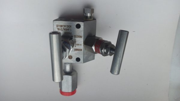N342.44.483.22 2-х ходовой вентильный блок PN420, DN5, нерж. сталь, Вход: внутренняя резьба 1/2 NPT, Выход: поворотная гайка G1/2, тестовое присоединение: внутренняя резьба 1/4NPT с заглушкой